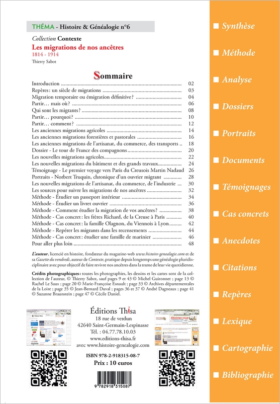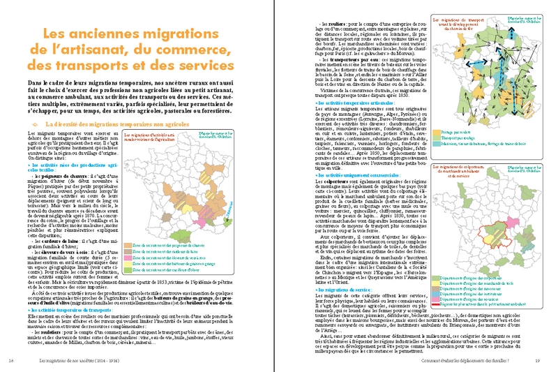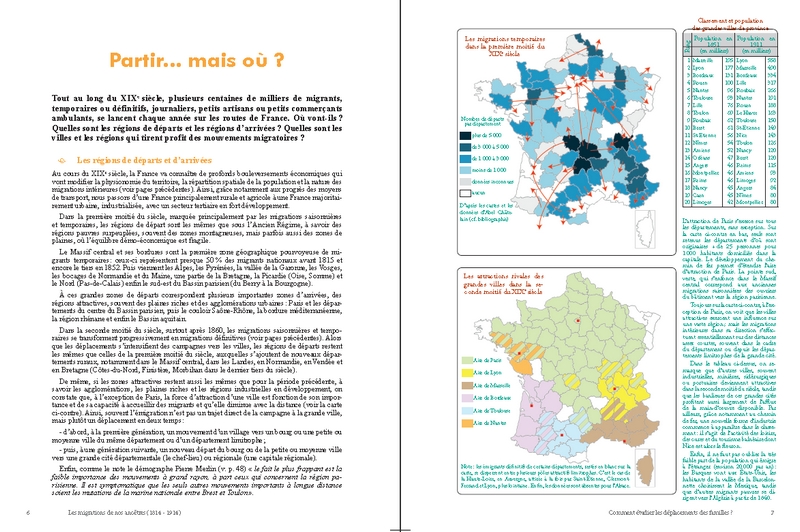 Ce fascicule a un double objet : définir et présenter les migrations de nos ancêtres en France métropolitaine au cours du XIXe siècle et, grâce à l’analyse de cas familiaux concrets et au suivi de lignées entières, essayer de comprendre les raisons et les modalités de ces déplacements, notamment identifier la cause du départ (« l’élément déclencheur »), puis reconstituer les étapes du chemin migratoire de nos grands-parents des campagnes vers les villes. Chacun y trouvera donc des éléments et des pistes de recherche pour retracer la migration de ses propres ancêtres.