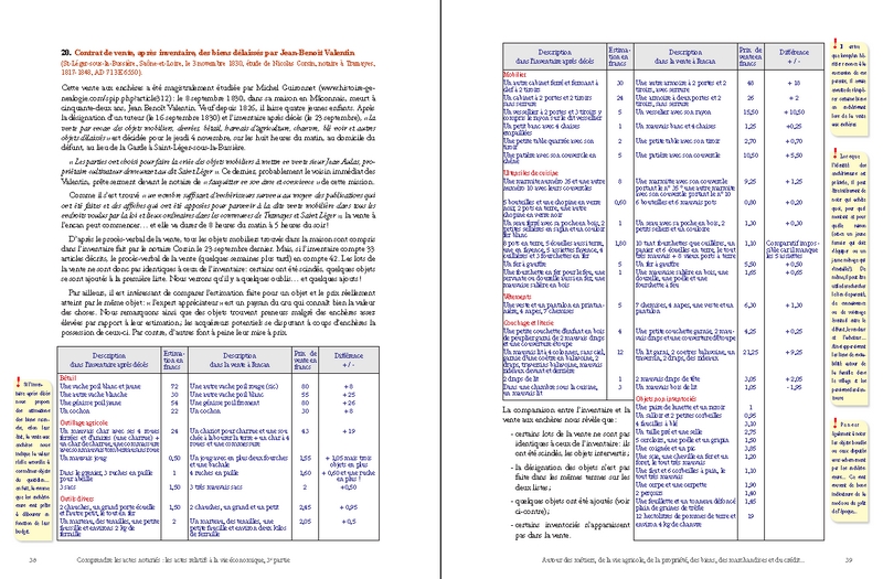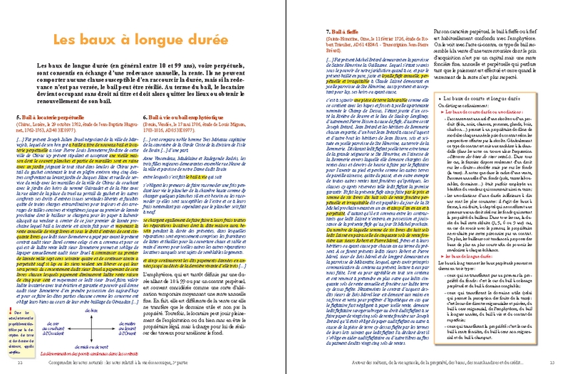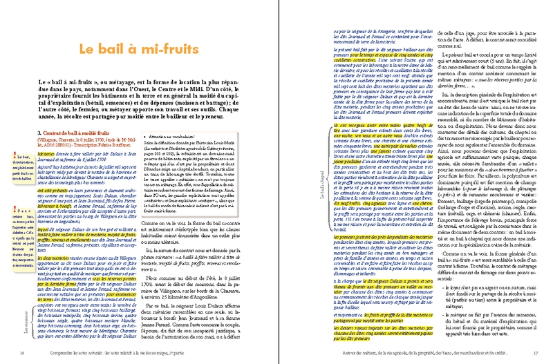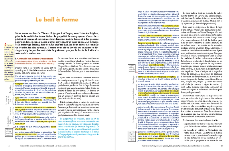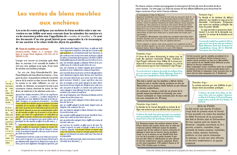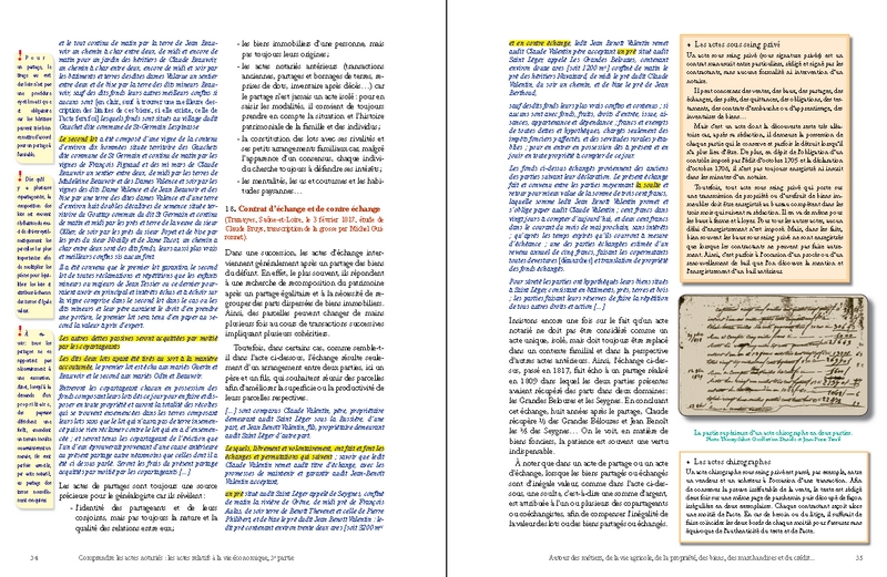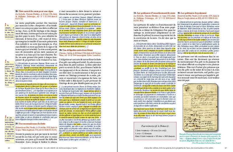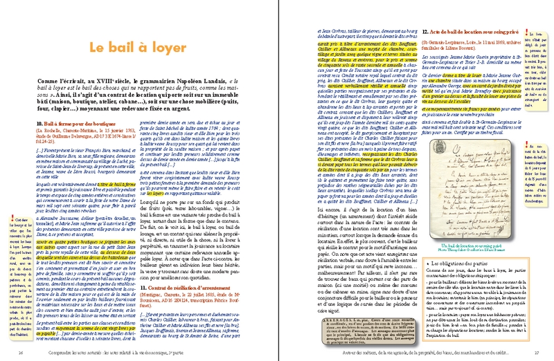 Cette prédominance du nombre des actes économiques s’explique d’ailleurs par l’importance des transactions concernant la propriété foncière : ainsi, les ventes, les partages et les échanges de biens immobiliers (maisons, boutiques, terres, prés, vignes, forêts…) et les baux de toutes natures liés à la gestion de la propriété agricole et à son exploitation (fermage, métayage, cheptel, location…) se rencontrent en abondance dans presque toutes les études de notaires. À côté de ces actes, le lecteur en découvrira d’autres tout aussi essentiels, souvent pittoresques, et d’un grand intérêt pour ses recherches : ce sont les visites de fermes, les devis de travaux et de réparations, les ventes aux enchères, les actes de crédit, les reconnaissances de dettes, les quittances, les obligations et les rentes les plus diverses…