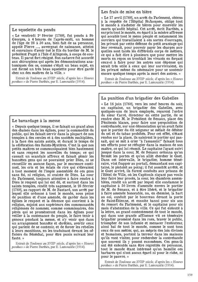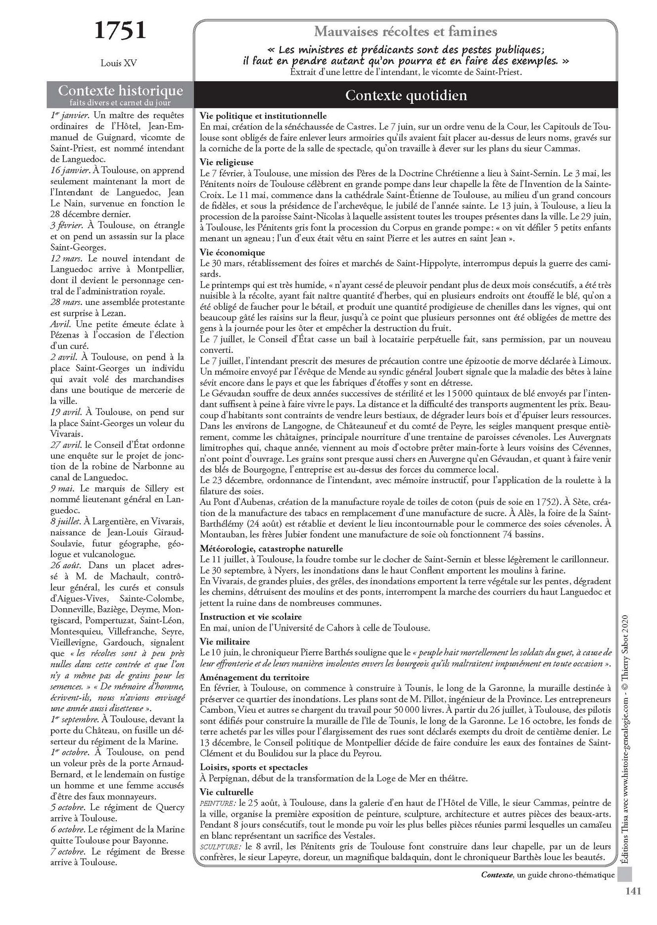 Toutefois, et c’est en cela que les déclinaisons régionales innovent, pour saisir au plus près le contexte quotidien local, j’ai complété le plus souvent possible le cadre chronologique par des témoignages d’époque, des récits de voyages, des mémoires, des livres de raison, des mentions insolites issues des registres paroissiaux, des documents historiques ou des récits d’historiens rédigés au fil des siècles passés. Ces témoignages, souvent commentés, sont présentés dans des encadrés qui s’insèrent entre les fiches chrono-thématiques. Par leur « authenticité » et leur diversité, ces récits plongent le lecteur dans un passé souvent insoupçonné. Ils nous livrent également une foule d’informations parfois anecdotiques, comiques, dramatiques, étranges ou énigmatiques. D’autant que la vaste région présentée ici ne manque pas de célèbres épisodes historiques : le catharisme et l’Inquisition, l’expansion du calvinisme, les soulèvements des Croquants, les épidémies de peste et autres maladies, les dragonnades, la révolte des Camisards et « le grand brûlement des Cévennes », l’affaire Calas, la bête du Gévaudan, l’affaire du comte de Solar, la révolte des masques armés, la contre-révolution de Jalès, l’auberge rouge de Peyrebeille, la révolte des « demoiselles », les réfugiés carlistes, les grèves de Carmaux, la crise viticole et la révolte des « gueux »...