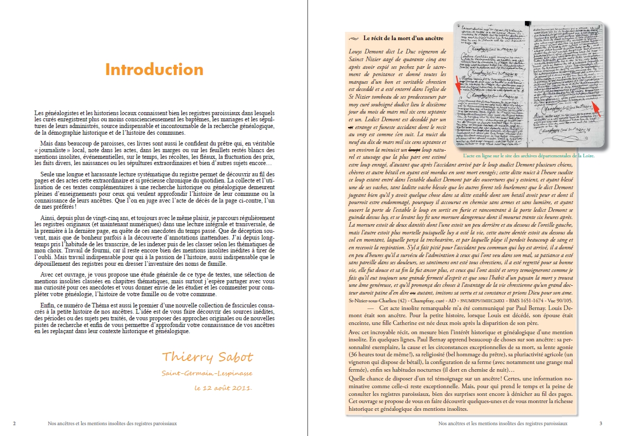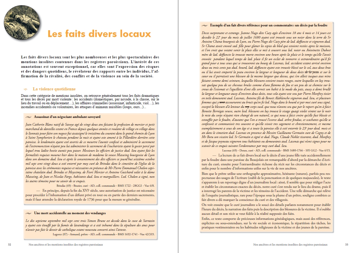 Avec cet ouvrage, je vous propose une étude générale de ce type de textes, une sélection de mentions insolites classées en chapitres thématiques, mais surtout j’espère partager avec vous ma curiosité pour ces anecdotes et vous donner envie de les étudier et les commenter pour compléter votre généalogie, l’histoire de votre famille ou de votre commune.